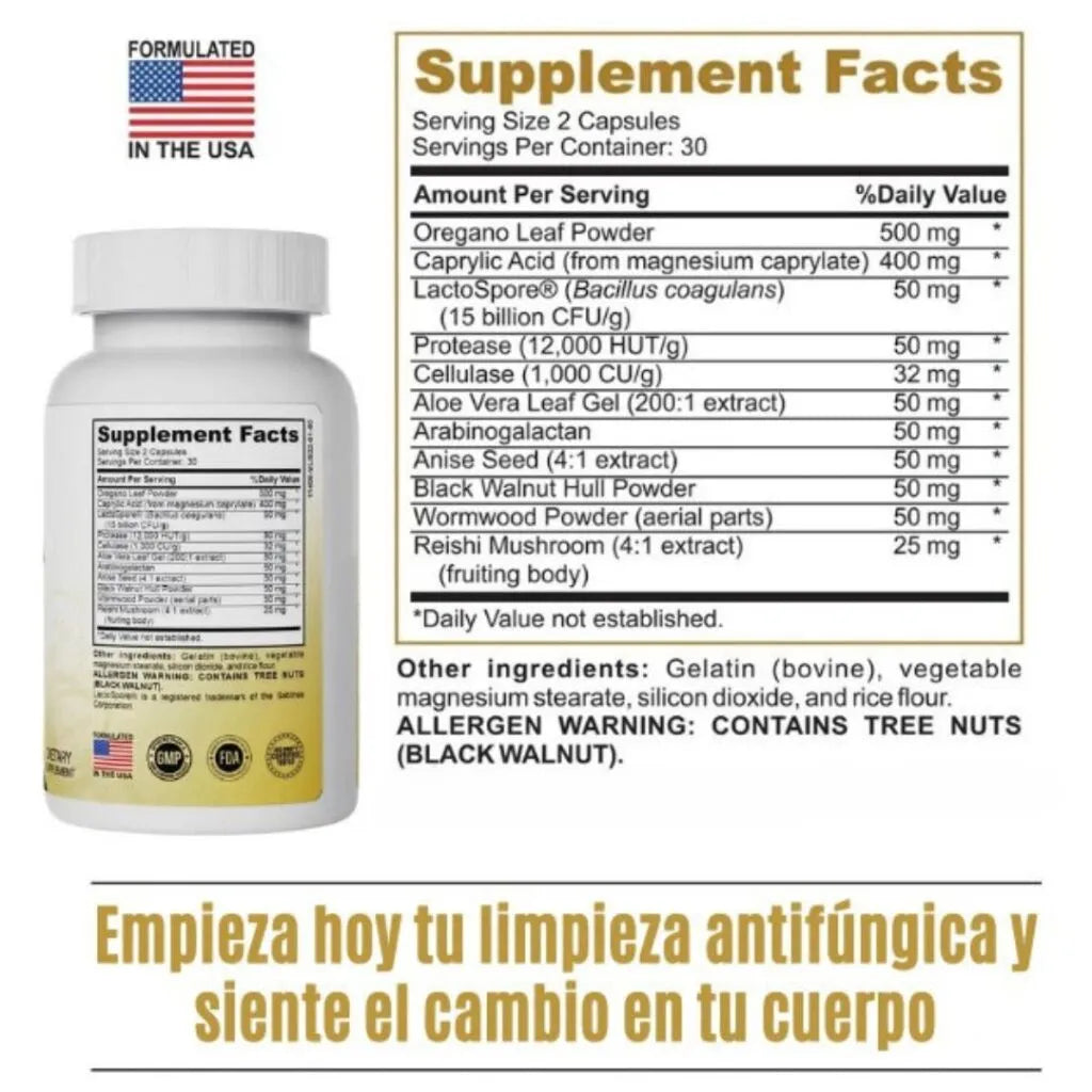 Con 1,200 mg de ácido caprílico, polvo de hoja de orégano y cáscara de nuez negra, esta poderosa fórmula 100% natural ayuda a eliminar el hongo cándida, mejorar la digestión y restaurar el equilibrio intestinal.