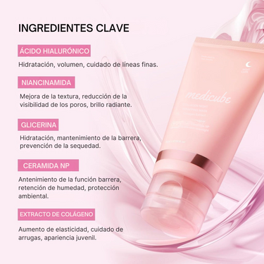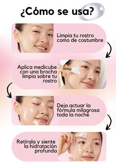 Es una mascarilla de colágeno que contiene una fórmula especial de HOYGI que, al aplicarse durante la noche permite una máxima absorción.