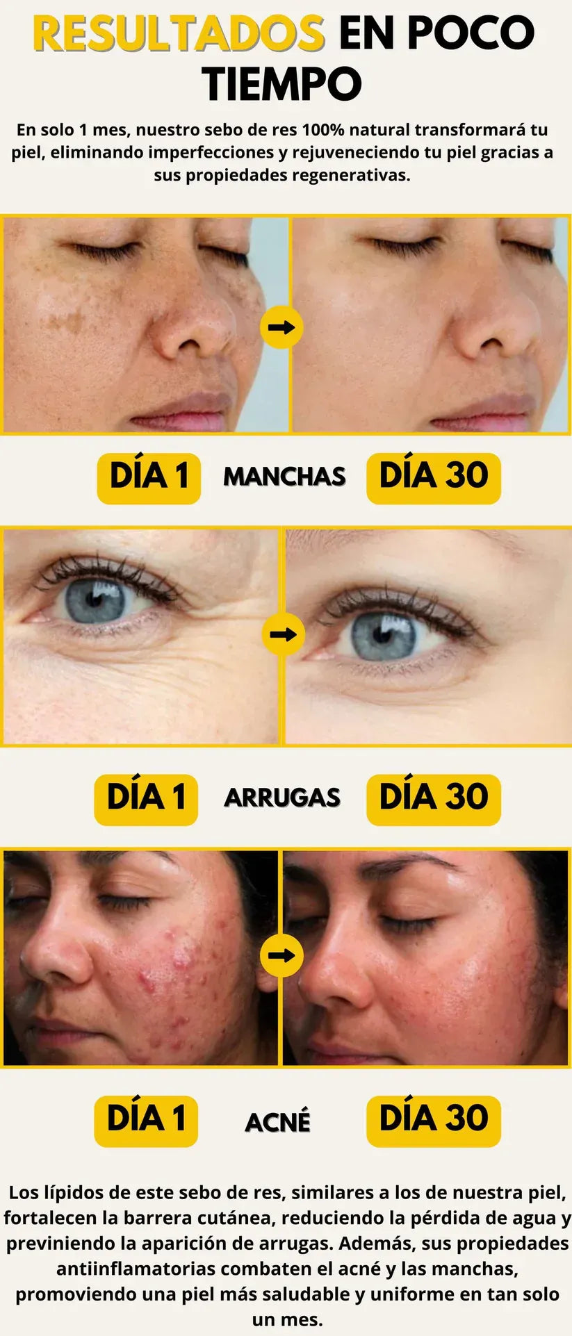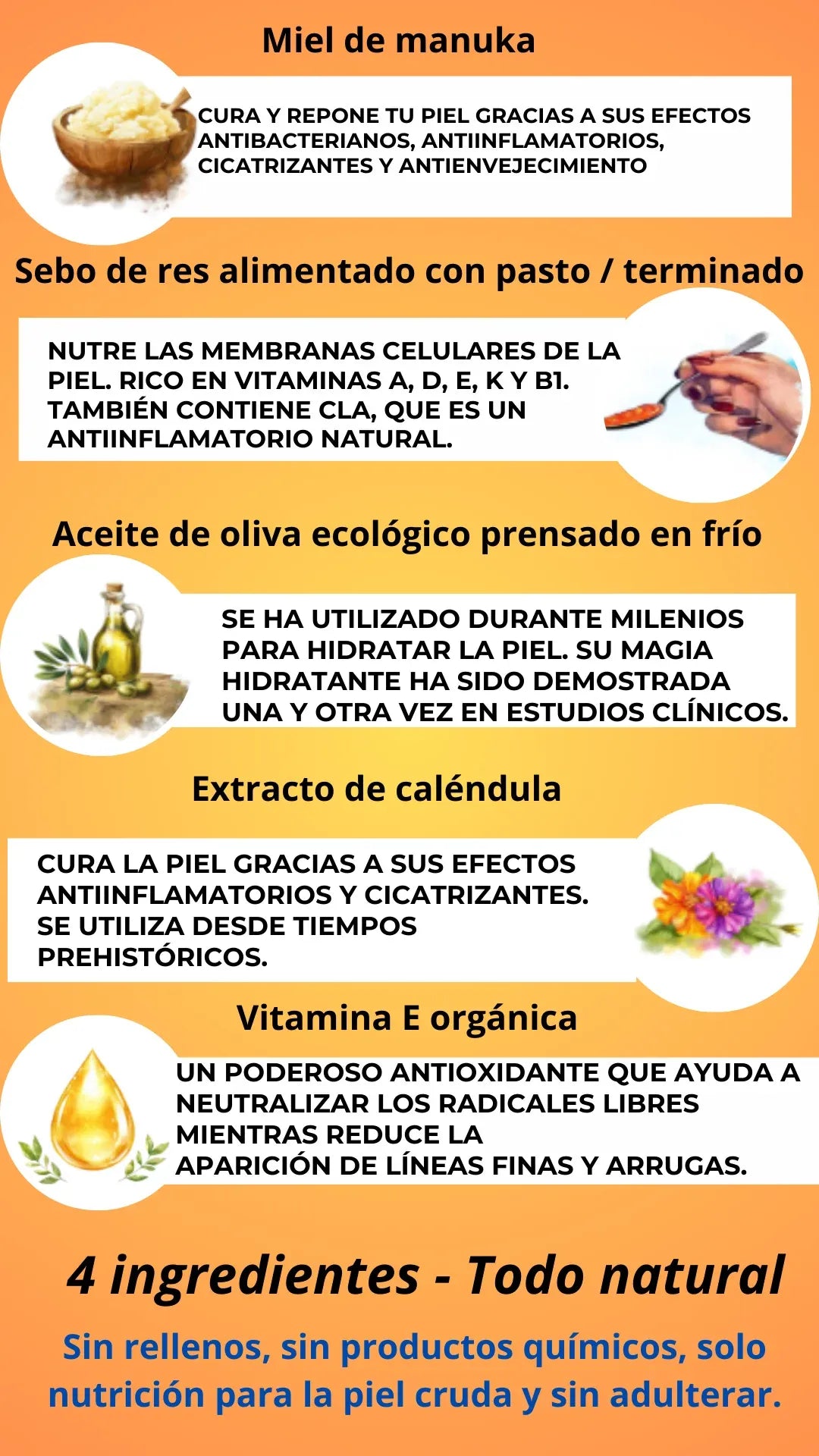 ✔ Sebo (grasa) de res de ganado grass-fed (alimentado con pasto). Extraída sin crueldad ni daños a los animales.